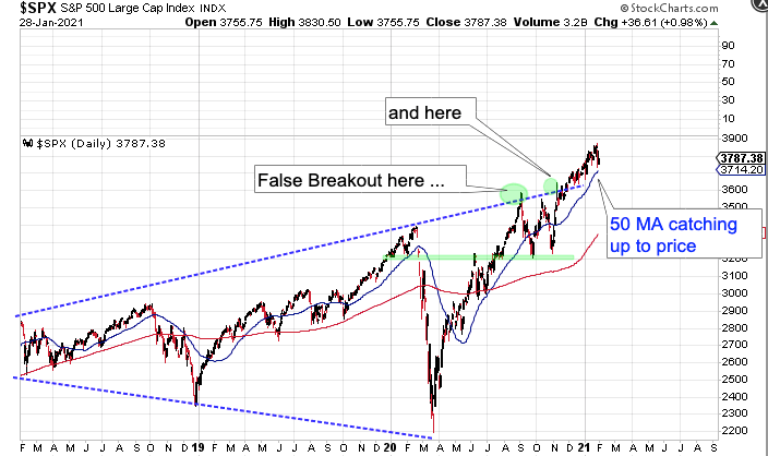 Stocks had a successful breakout of the megaphone pattern. But stocks got stretched above the 50 day MA. Wednesday’s drop has allowed the 50 day MA to catch up to price. A swing low off of support of the 50 day MA should resume the breakout.