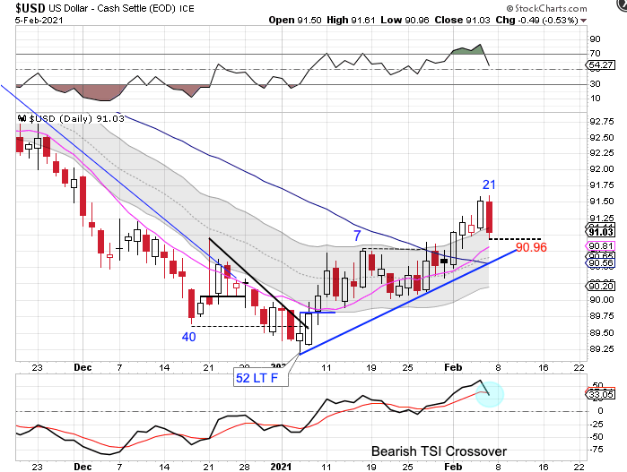 The dollar printed a huge bearish reversal on Friday. This eases the parameters for forming a swing high. A break below 90.96 will form a swing high. Then a break below the daily cycle trend line will indicate the daily cycle decline.