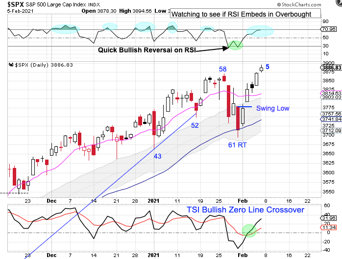 Friday was day 5 for the new daily cycle. The quick bullish reversal of RSI is characteristic of an intermediate cycle advance. RSI is approaching overbought. If RSI embeds in overbought that would indicate a resumption of the intermediate cycle advance.