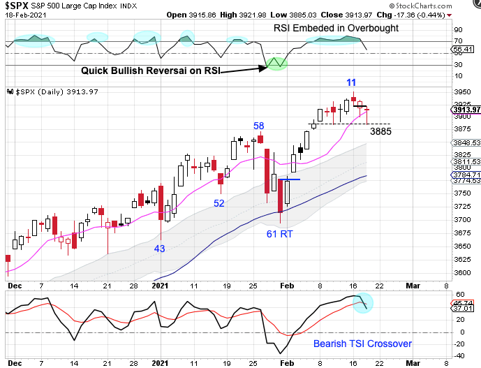 As we discussed on Monday, stocks are 21 weeks into their intermediate cycle so we need to be watchful for signs of a left translated daily cycle formation that could lead to an intermediate cycle decline. If stocks deliver bearish follow through and close below the 3885 support level then the odds will begin to shift to a left translated daily cycle formation.