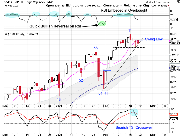 Stocks became a bit stretched above the 10 day MA on Tuesday, day 11. Stocks drifted lower into Thursday, forming a bullish reversal off of the 10 day MA. While stocks closed lower on Friday, they did form a swing low. We will use Friday’s swing low to construct the daily cycle trend line. Stocks are in a daily uptrend. If they deliver bullish follow through then they remain in their daily uptrend and trigger a cycle band buy signal.