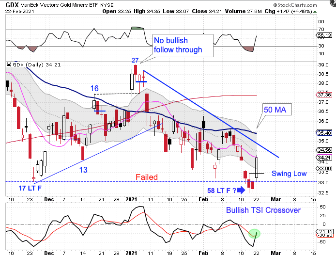 What we need to see is a convincing close above the 50 day MA that has bullish follow through to signal that the Miners are ready for a trending move. Back in early January the Miners did manage to close above the 50 day MA. However, they were not able to deliver bullish follow through. Unless the Miners can close convincingly above the 50 day MA and deliver bullish follow through, this will only be a minor bounce.