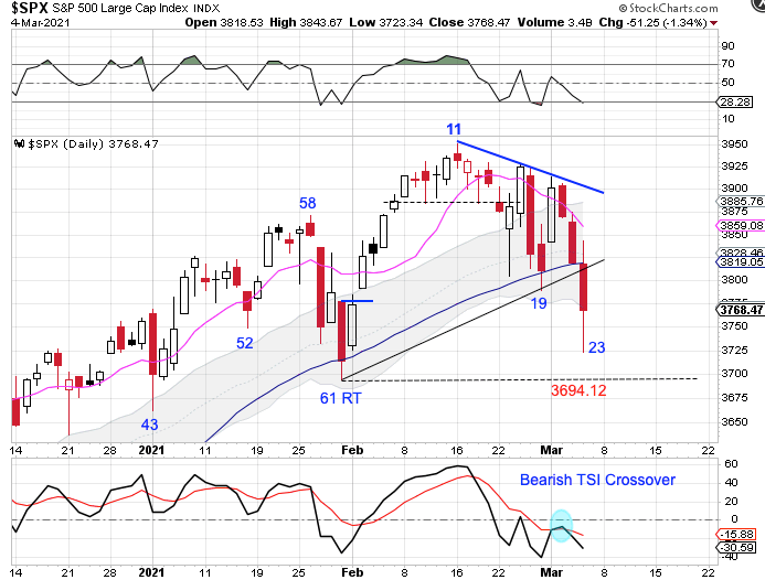 Stocks also closed below the lower daily cycle band on Thursday. Closing below the lower daily cycle band ends the daily uptrend uptrend begins a daily downtrend, giving us the expectation of lower highs and lower lows. The peak day 11 sets stocks up for a left translated daily cycle. A. break below the previous daily cycle low of 3694.12 will form a failed daily cycle.