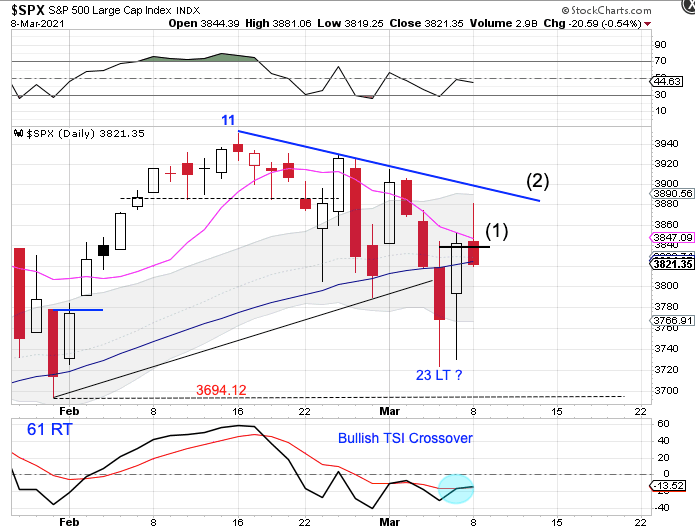 First – Stocks need to recover the 50 day MA and go on to close above the 10 day MA. Doing so will have us label day 23 as an early DCL. The previous DCL was stretched at 61 days. Often times cycles will follow a stretched cycle with a shortened cycle — which balances out the cycle counts.