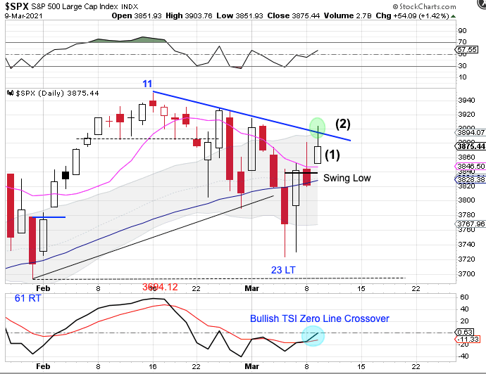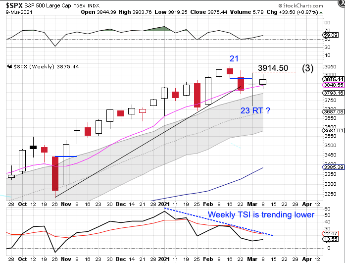 However, stocks have yet to form a weekly swing low (3). We will use the close above the 10 day MA and declining trend line break to label day 23 as the DCL. We are still waiting for a break above 3914.50 to form a weekly swing low to signal that the intermediate cycle low has been set.