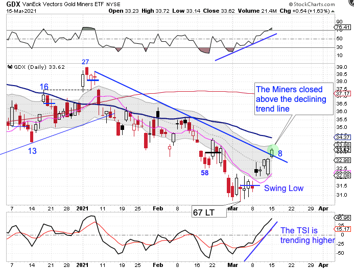 The Miners closed above the declining trend line on Monday.