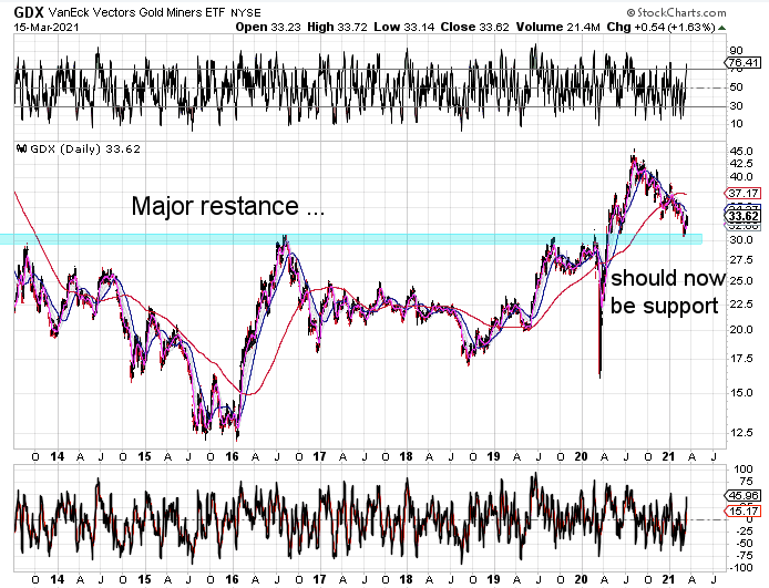 The big picture is that the Miner broke out above a major multi resistance level and is not backtesting that zone. A close above the 50 day MA would signal a successful backtest of the the resistance/support zone indicating that the Miners are ready for the next leg up.