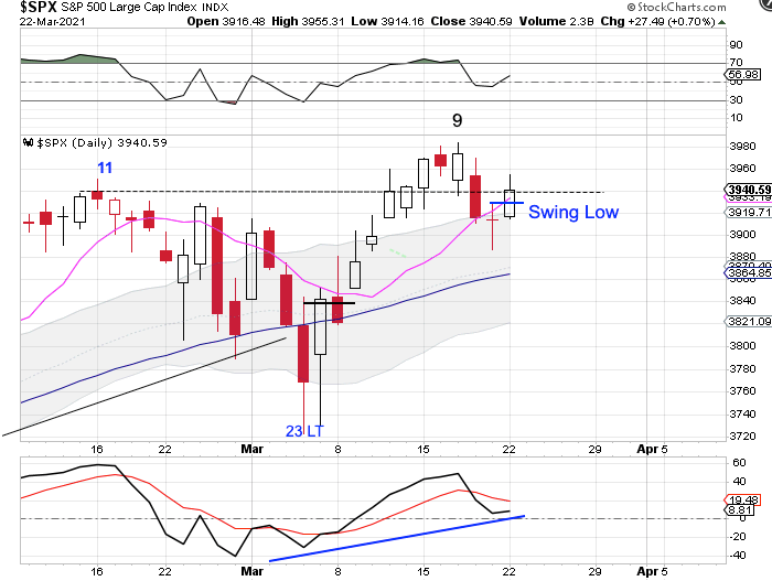 When stocks closed below the 10 day 10 MA on Friday, that opened the door to a possible left translated daily cycle formation. But stocks negated Friday’s close by closing above the 10 day MA and above the upper daily cycle band on Monday.