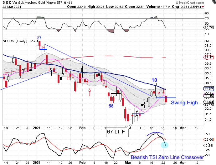 The Miners were rejected by the 50 day MA and closed lower on Tuesday. They formed a swing high and closed below the 10 day MA. A close below the lower daily cycle band will signal the daily cycle decline. With a peak on day 10 sets up a possible left translated daily cycle formation and continuation of the intermediate cycle decline.