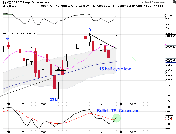 Stocks formed a bullish reversal off of support of the 50 day MA on Thursday. Then delivered bullish follow through on Friday by forming a swing low, closing above the 10 day MA and the 3940 resistance level so we will label day 15 as the half cycle low. Stocks are in a daily uptrend. Forming the swing low above the upper daily cycle band indicates that stocks will remain in their daily uptrend and triggers a cycle band buy signal.