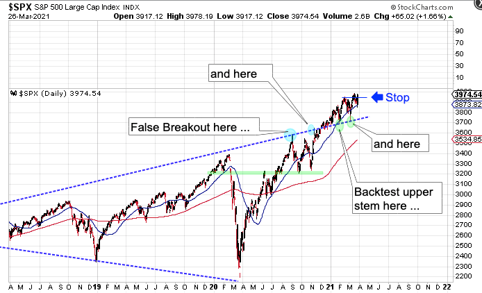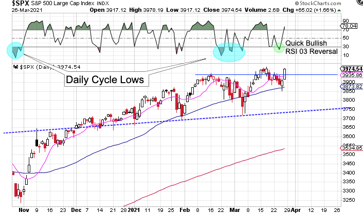 Closing above the 3940 resistance level signals the continuation of the intermediate cycle advance. The 3940 level should now be support, which will be our stop.