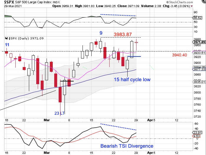 Monday was day 17 for the daily equity cycle. A break above the day 9 high of 3983.87 will shift the odds towards a right translated daily cycle formation.