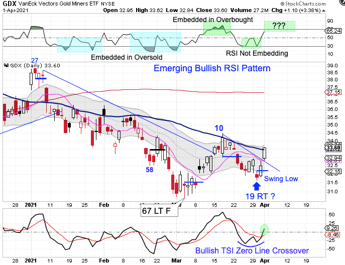 There is a bullish zero line crossover on the True Strength Indicator, which often accompanies a DCL. And there is also a change in behavior on RSI 05. Prior to the day 67 DCL, RSI did not even get overbought before reversing and then embedded in oversold. That pattern is changing. The RSI became embedded in overbought during the peak of the pervious cycle. It reversed quickly once oversold and is now heading back up to overbought. If is embeds again in overbought that will be a good indication that the Miners are now in the advancing phase of a new intermediate cycle.