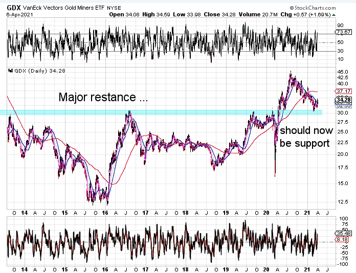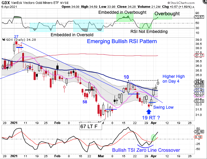 Prior to the March day 67 DCL the Miners were in a daily downtrend characterized by forming lower highs and lower lows. The day 19 DCL was the first higher low and now on Tuesday the Miners printed a higher high –> which ends the pattern of lower highs and lower lows. The Miners also closed above the upper daily cycle band. Closing above the upper daily cycle band indicates that the Miners are now in a daily uptrend. That aligns with the emerging bullish RSI pattern. Prior to the day 67 DCL, RSI 5 would embed in oversold and reverse quickly once overbought. That patterns is changing. RSI became embedded in overbought at the peak of the March daily cycle. RSI did not embed in oversold as the Miners printed the day 19 DCL. Instead, RSi reversed quickly and is now oversold.