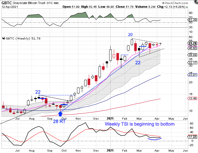 Since peaking in February, GBTC has been forming a weekly triangle consolidation pattern.