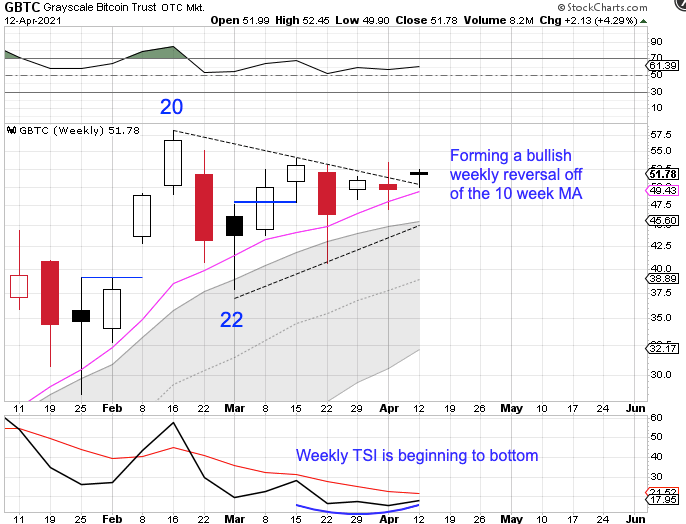 GBTC is in the process of forming a bullish weekly reversal off of the 10 week MA and is breaking bullishly above the declining weekly trend line. The bullish break above the declining trend line indicates that GBTC will remain in its weekly uptrend and triggers a weekly cycle band buy signal.