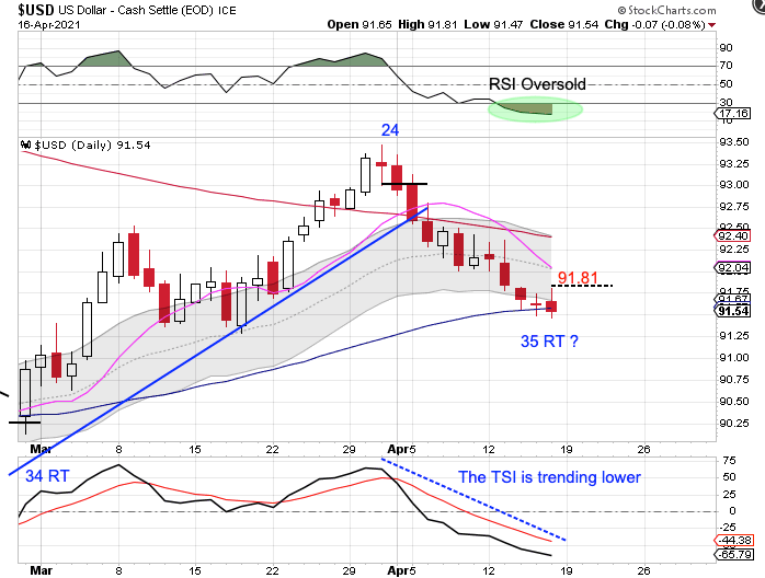 Friday was day 35, placing the dollar deep in its timing band for a DCL. A swing low and close back above the 50 day MA will signal a new daily cycle. A break above 91.81 will form a daily swing low.