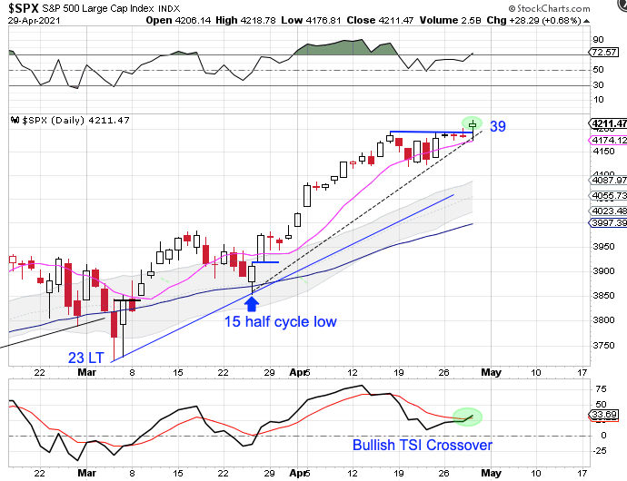 Thursday was day 39 for the daily cycle. That places stocks in their timing band for a daily cycle decline. Instead, stocks backtested the 10 day MA then broke out to a new all-time high on Thursday. This allows us to construct an accelerated trend line.