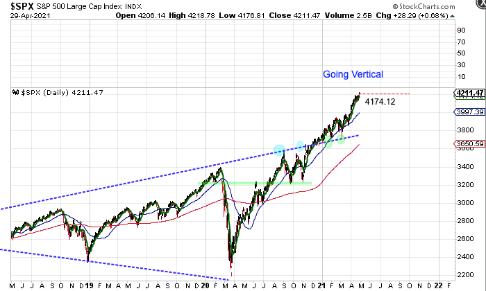 Stocks have been going vertical since the March DCL. Stops can be raised to the pivot that was formed by backtesting the 10 day MA – 4174.12