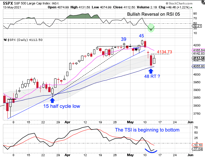 Stocks printed their lowest point on Wednesday, day 48. That places stocks in their timing band for a daily cycle low. The daily cycle decline was stopped at support from the 50 day MA. And with stocks currently being in a daily uptrend, if stocks form a swing low above the upper daily cycle band then that will indicate that stocks will remain in their daily uptrend and trigger a cycle band buy signal. A break above 4134.73 will for a daily swing low. Then a close back above the 10 day MA will have us label day 48 as the DCL.