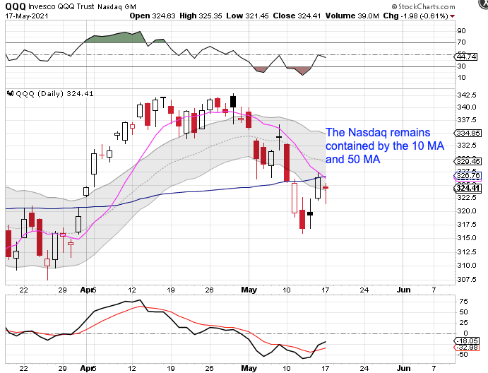 However, the Nasdaq remains contained by the 10 day MA and the 50 day MA. The Nasdaq needs to break above this resistance before the rally can gain traction.