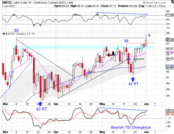 Oil broke above the March high on Tuesday, establishing a new yearly cycle high.