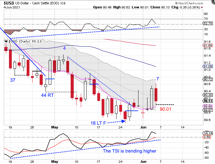 Friday was day 7 for the dollar’s daily cycle. Friday’s bearish reversal sets the dollar up for a left translated daily cycle formation. A swing high and close below the 10 day MA would signal the daily cycle decline. The dollar is in a daily downtrend. If the dollar forms a swing high below the upper daily cycle band then the dollar will remain in its daily downtrend and trigger a daily cycle sell signal. A break below 90.01 will form a daily swing high.