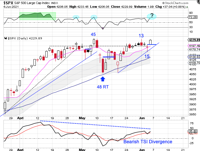 The rally out of the day 48 DCL did see stocks become stretched above the 10 day MA. Thursday’s bullish reversal allowed the 10 day MA to catch up to price. A break above the day 13 high will have us label day 15 as the half cycle low.
