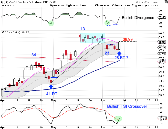 The Miners printed their lowest point on Thursday, day 28. This places them in their timing band for a daily cycle low. Thursday’s bullish candle is a buy signal since regaining the 10 day MA this late in the daily cycle has good odds of marking the DCL. A swing low will have us label day 28 as the DCL. The Miners are currently in a daily uptrend. If they form a swing low above the lower daily cycle band, they will remain in their daily uptrend and trigger a cycle band buy signal. A break above 38.99 will form a daily swing low.