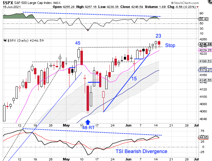Stocks broke out to a new high last week, but have not delivered any bullish follow through. We are starting to see bearish divergences developing on the oscillators. This has me concerned that Wednesday’s statement might trigger a ‘sell the news’ response. A swing high and close below the 4240 breakout level would indicate the daily cycle decline.
