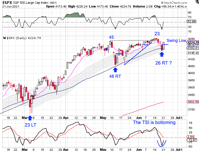 Stocks printed its lowest point on Friday, day 26, which is a bit early for a DCL. Stocks have been in a daily uptrend that has been characterized by highs forming above the upper daily cycle band and lows forming above the lower daily cycle band. Monday’s swing low formed above the lower daily to indicate that stocks remain in their daily uptrend and trigger a cycle band buy signal. A close above the 10 day MA will have us label day 26 as the DCL.