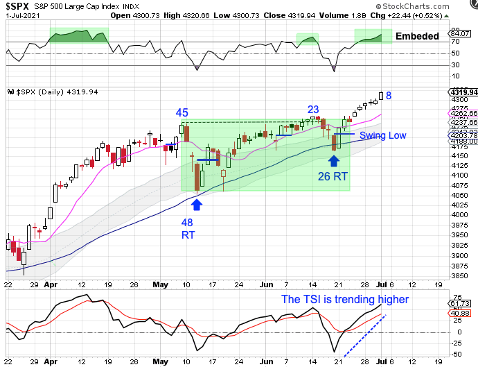 RSI 05 has become embedded in overbought, which indicates that stocks are resuming their intermediate cycle advance.