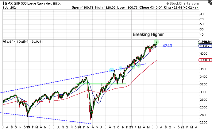 Stocks broke above the 4240 and are now delivering bullish follow through. This is turning into a bullish trending move which may be the start of a melt up phase.