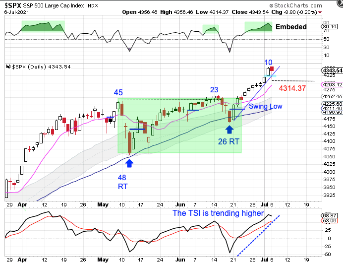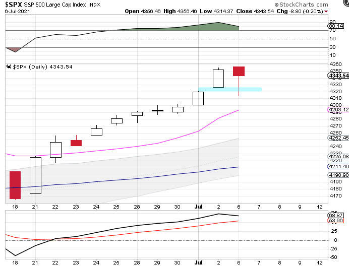 Stops can be moved up to Tuesday’s low of 4314.37.