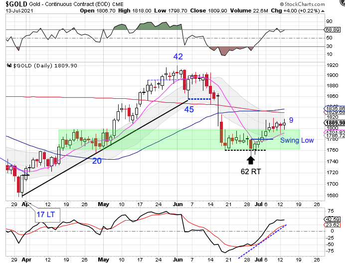 Tuesday was day 33 for the daily dollar cycle. Which places the dollar in its timing band for a daily cycle decline. Gold may be sniffing out a top to the dollar’s daily cycle. Gold may also be sniffing out the top to the dollar’s intermediate (weekly) cycle, as well. I plan to cover the dollar’s intermediate cycle in this week’s Weekend Report. And if the dollar does roll over into an intermediate cycle decline, that should provide the tail wind necessary for gold to break above the dual resistance of the 200 day MA And the 50 day MA to begin a trending move.