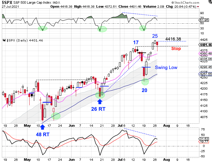 Scenario 2 would be for stocks to form a swing low. Stocks have been in a daily uptrend that has been characterized by highs forming above the upper daily cycle band and lows forming above the lower daily cycle band. If stocks form a swing low above the lower daily cycle band, that would signal that stocks will remain in their daily uptrend and trigger a cycle band buy signal. A break above 4416.38 forms a daily swing low.
