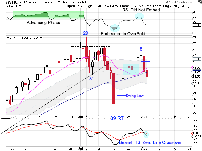 Oil forming a lower high along with a peak on day 8 sets oil up for a left translated daily cycle formation which signals that the intermediate cycle decline has begun. RSI embedded in oversold during the day 39 DCL. RSI then reversed quickly once it became overbought. This change in behavior in RSI aligns with oil rolling over into an intermediate cycle decline. If RSI embeds once again in oversold that will signal the intermediate cycle decline. And with Tuesday was only day 10, oil can trend lower for another 3 – 4 weeks before printing its DCL.