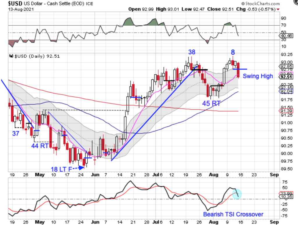The peak on day 8 sets the dollar up for a potential left translated daily cycle formation. Friday’s swing high closed below the 10 day MA. Any bearish follow through will signal the daily cycle decline. The dollar is currently in a daily uptrend. But a close below the lower daily cycle band will end the daily uptrend and begin a new daily downtrend.