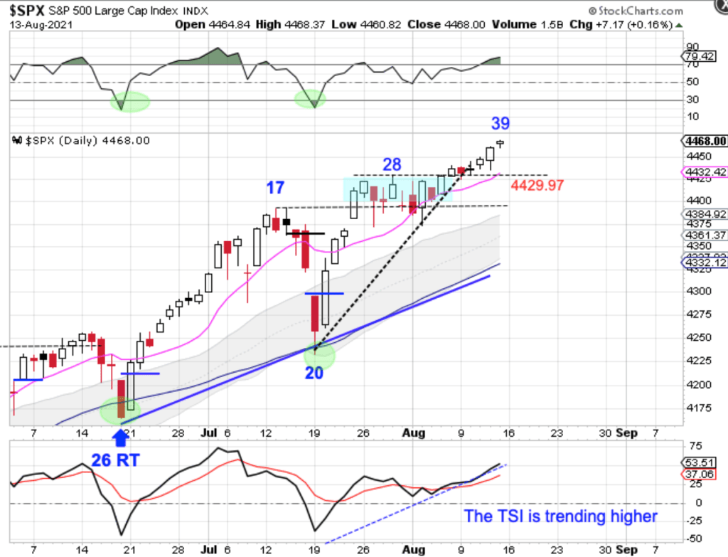 However, there is the potential for stocks to begin a melt-up phase. Therefore the trailing 10 day MA could now be used as the stop. Stocks are currently in a daily uptrend. They will remain in their daily uptrend unless they close below the lower daily cycle band.