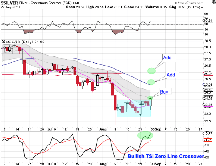 Silver has been consolidating below the 24 level for the past 3 weeks. Silver broke above consolidation on Friday, which could lead to a trending move. Closing above 24 was a buy signal. Positions can be added to with a close above the 50 day MA, then again on a close above the 200 day MA. The first stop would be a close back in consolidation. The next would be a close back below the 50 day MA. Then once above the 200 DMA, using that as the stop.