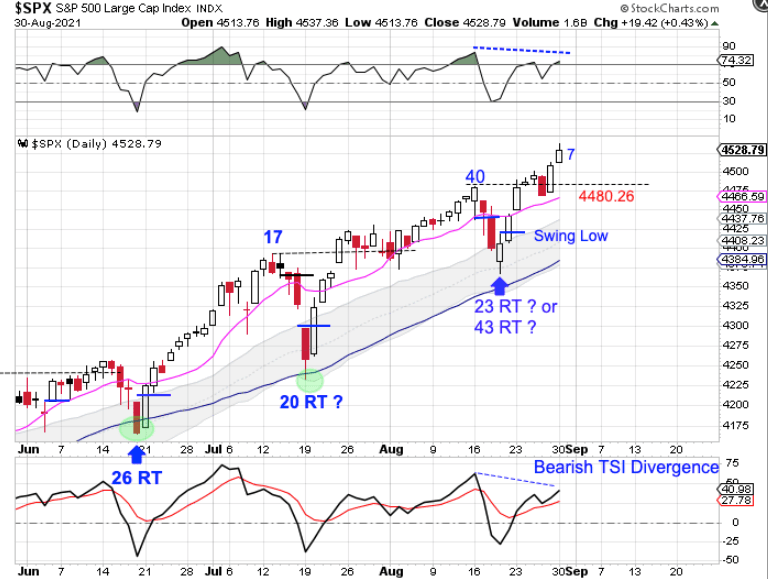 The declines in June, July and now August have not satisfied the usual criteria for a DCL. We are seeing 4 – 5 day declines that are being bought buy “dip buyers”, which is obscuring our timing bands.