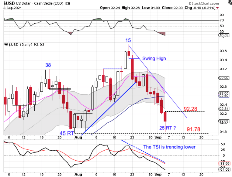Friday was day 25 for the daily dollar cycle, which places it in its timing band for a DCL. Closing below the 50 day MA signals that the intermediate cycle decline has begun. The dollar also closed below the lower daily cycle band. Closing below the lower daily cycle band ends the daily uptrend and begins a daily downtrend. It is another signal that the intermediate cycle decline has begun. However a failed daily cycle is needed to confirm the intermediate cycle decline. A break below the previous DCL of 91.76 will form a failed daily cycle.