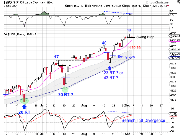 At 26 weeks, stocks are due for an intermediate cycle decline. There are bearish divergences developing on the oscillators. With a peak on day 10, if stocks deliver bearish follow through to close below the 10 day MA that would set stocks up for a left translated daily cycle formation. Then a break below the previous daily cycle high of 4480.26 can be used as a hard stop to to avoid a potential ICL decline.