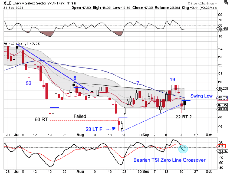 XLE broke below both the 50 day MA and the 10 day MA to print its lowest point on Monday, day 22, placing XLE in its timing band for a DCL. XLE is in a daily uptrend. Forming a swing low above the lower daily cycle band indicates a continuation of the daily uptrend. A close above the converging 50 day MA and 10 day MA will signal a new daily cycle and trigger a cycle band buy signal.