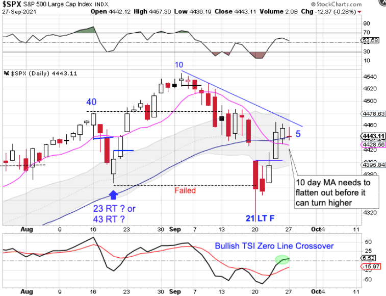 One of the confirmations of a DCL is turning the 10 day MA higher. The decline into the day 21 DCL caused the 10 day MA to turn steeply lower. Stocks may need to consolidate for a few days in order to allow the 10 day MA to flatten before it can turn higher. Then stocks should go on to break above the declining trend line as they rally out of the DCL. Stocks are currently in a daily downtrend. But a close above the upper daily cycle band will end the daily downtrend and begin a new daily uptrend.