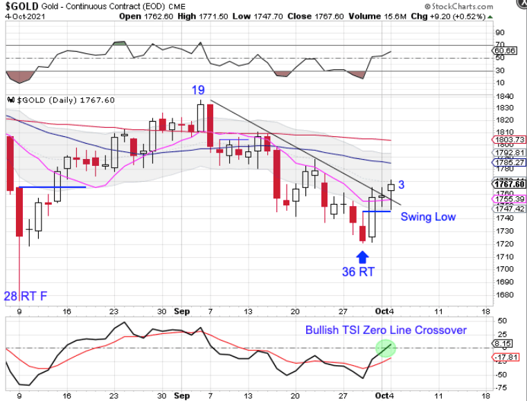 Gold printed its lowest point on day 36 to place it deep in its timing band for a DCL.