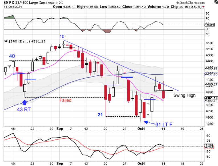 …stocks still need to close above the declining trend line for confirmation that day 31 was the DCL. Instead, stocks formed a lower swing high on Monday. Stocks are currrenrlty in a daily downtrend. Forming a swing high below the upper daily cycle band signals a continuation of the daily downtrend and triggers a cycle band sell signal.