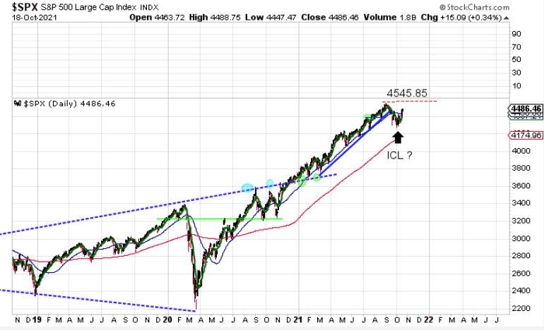The decline into the ICL has stretched the ‘elastic band’ lower. A quick recovery of the all time highs could trigger a final melt-up phase.