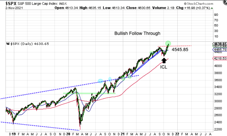 The decline into the ICL stretched the ‘elastic band’ lower. Stocks are delivering bullish follow through on the breakout of the 4545.85 level. This could trigger a melt-up phase.