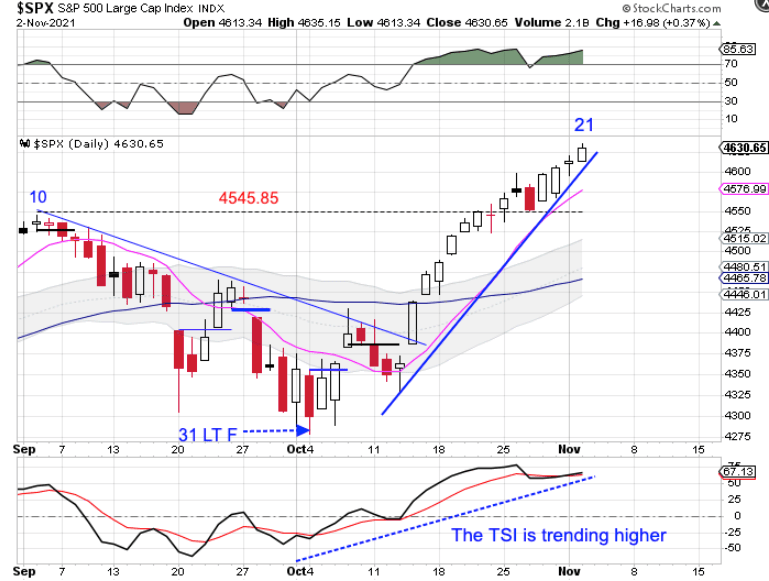 Tuesday was day 21 for the daily equity cycle. The new high on day 21 shifts the odds towards a right translated daily cycle formation. That aligns with stocks being in a daily uptrend. Stocks will remain in their daily uptrend unless they close below the lower daily cycle band.
